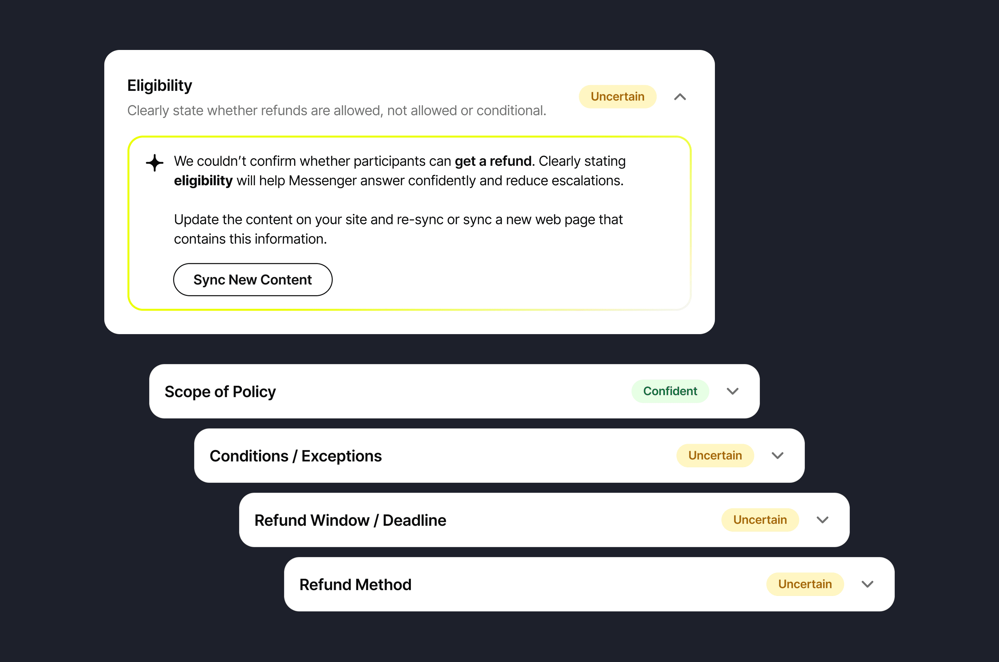 For example, “Can I get a refund?” relies on clear information about eligibility, deadlines, fees and the process. If anything is missing, Messenger marks the answer as uncertain and highlights what needs improving.