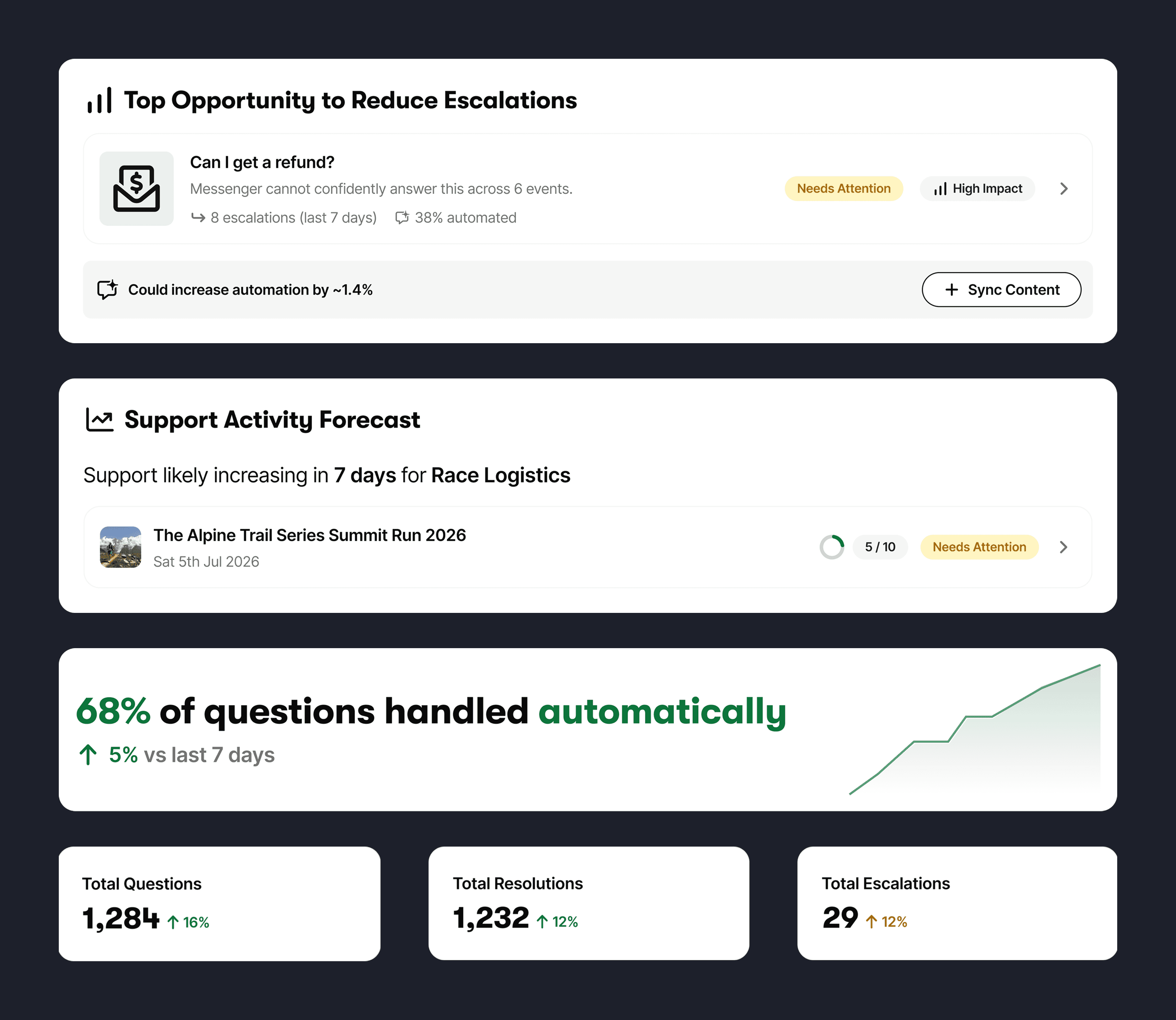 Top opportunities to reduce escalations: Messenger highlights where improving content could increase automation and prevent participant questions from reaching support.