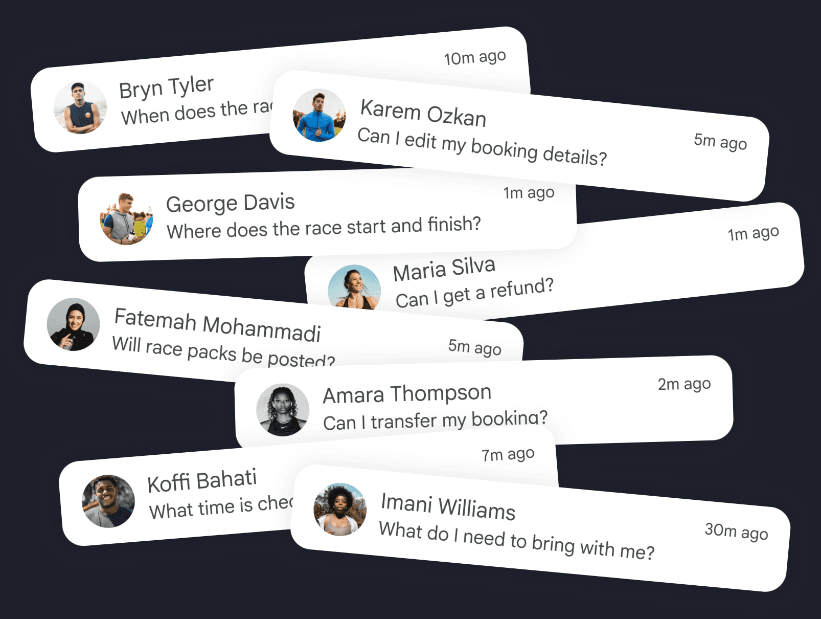Support volume spikes in the weeks before race day, leaving organisers answering the same questions instead of focusing on delivering the event.