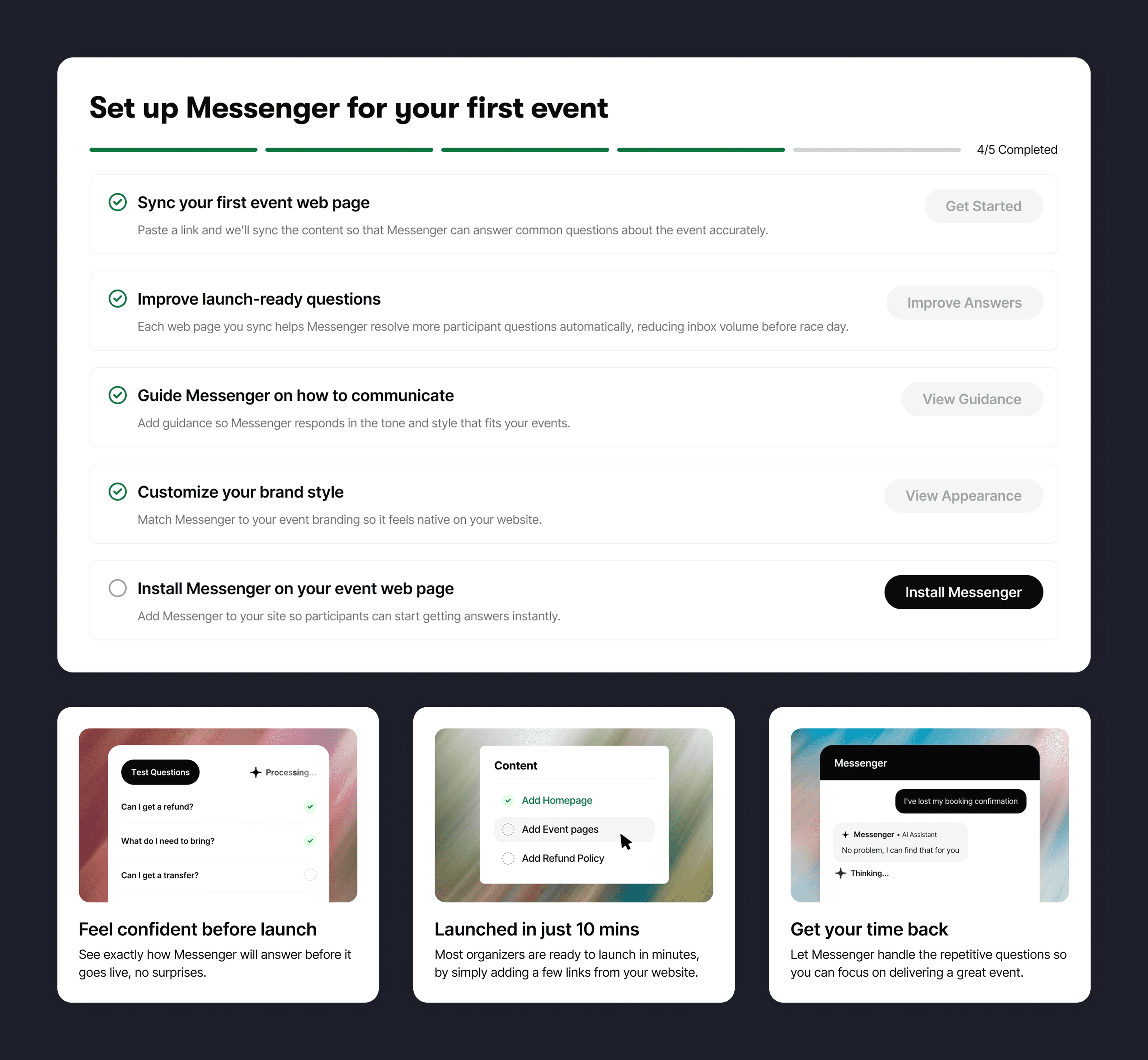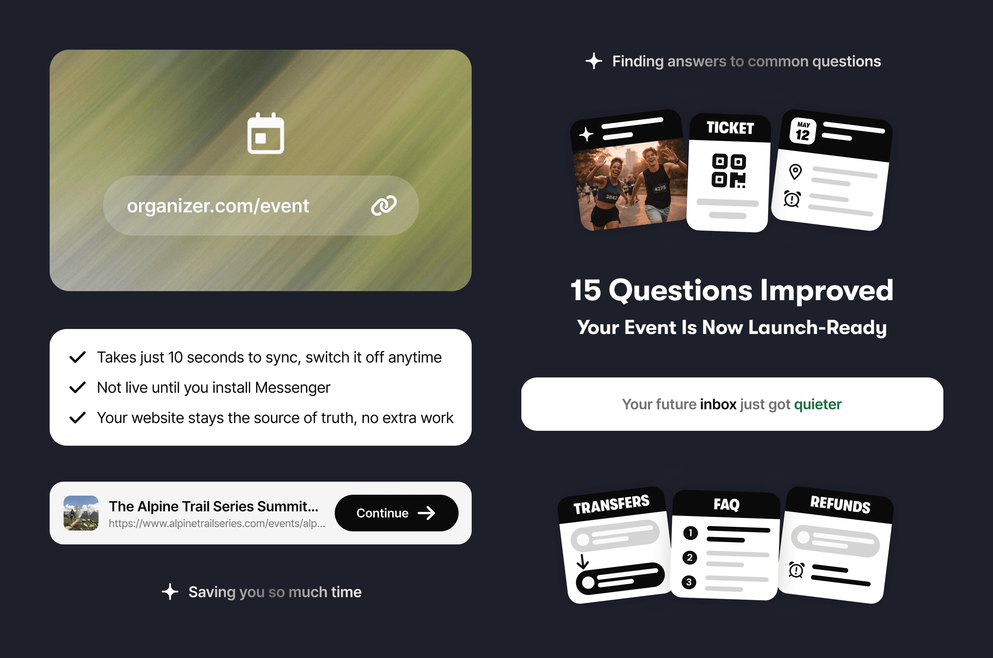 Messenger therefore encourages organisers to start by syncing one event page. This creates a bridge between the organiser’s website and the assistant, allowing Messenger to learn from the event’s existing content.
