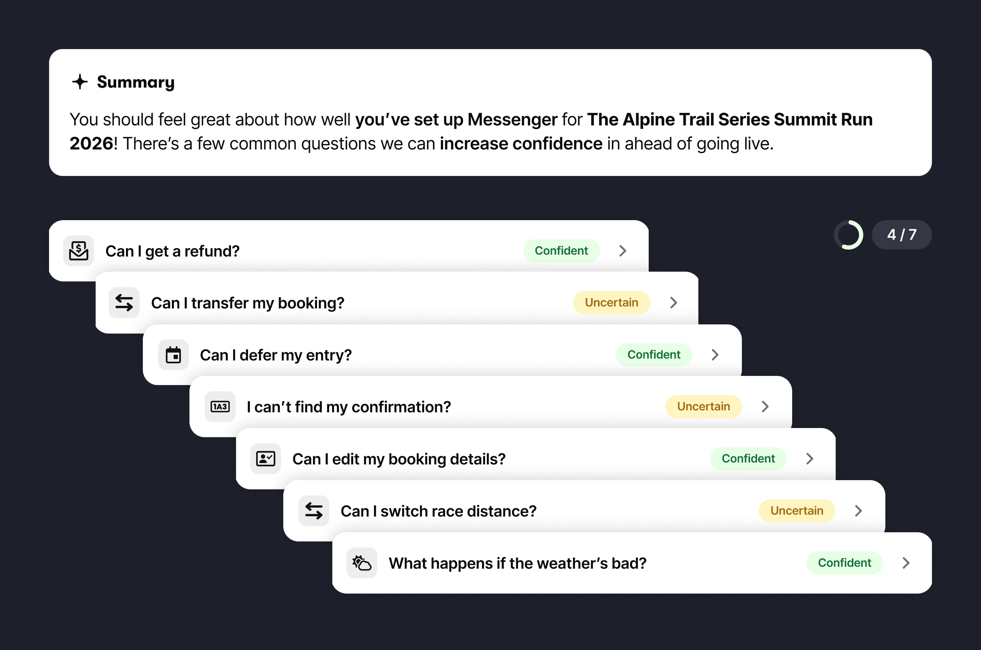 To make reliability visible, Messenger tests a set of common participant questions against the organiser’s content before launch.